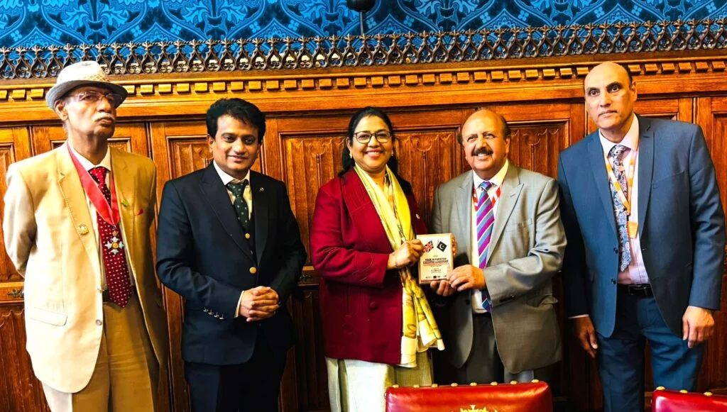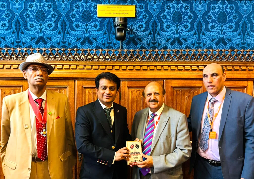 Mr. Rizwan Jaffar Founder Made in Pakistan Movement received the Made in Pakistan Executive Leadership Award from Lord Qurban Hussain in the presence of Mr. Rashid Iqbal CEO Pakistan Britian Business Council & Hon. Alderman Mushtaq Lashari at the Houses of Parliament, Palace of Westminster, London
